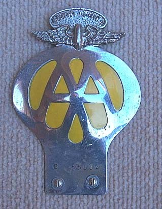A one-piece convex badge. Chrome plated and painted yellow between the AA's. Top tablet is double sided. Both English and Afrikaans versions were available.