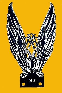A brass badge, chrome plated and in the design of a Springbok head with wings either side. Intertwined AA's between the horns.