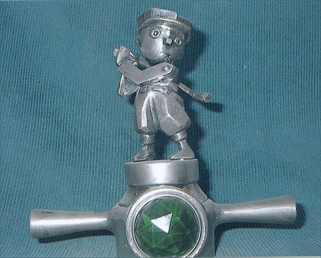 A comic golfer mounted on a radiator cap base with a large green jewel in its centre.