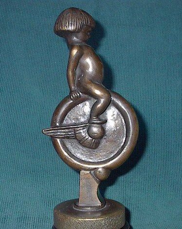 A large and heavy, bronze German mascot showing a young girl on a winged-wheel. An early accessory mascot for Audi. Notice the 1 that joins the wheel to the cap. The girl has a typically German hairstyle.