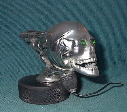 A skull illuminated by a bulb shining through the green jewel eyes. The jaw is on a hinge which allows it to bounce open and shut when the car goes over bumps.