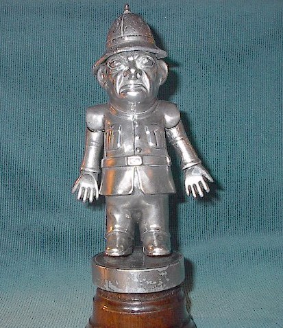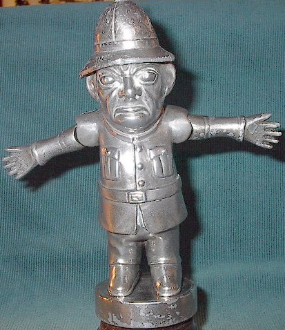 From the 1920s. When the car stops this policeman rocks forward and his arms fly up! When the car turns right, the right arm flies up and the same with a left turn. This is a large mascot, standing some 8 1/2 inches high.