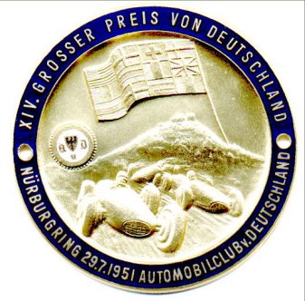 Nürburgring 1951 German Grand Prix. The badge has a fine enamelled border and the logo of AvD - Automobilclub von Deutschland. Made from brass and gold plated. Measures 80mm in diameter.
