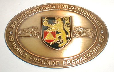 The 33rd Internationale Horex-Sternfahart 1987 badge. Measures 3" x 4 3/82".