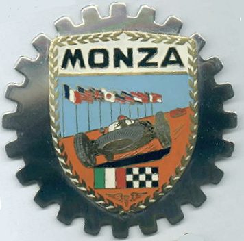 A pressed metal badge depicting the Monza motor race. The front image is enamelled and the back has bolts for grill mounting. The diameter is 3.1/4" and the badge was made in Spain.