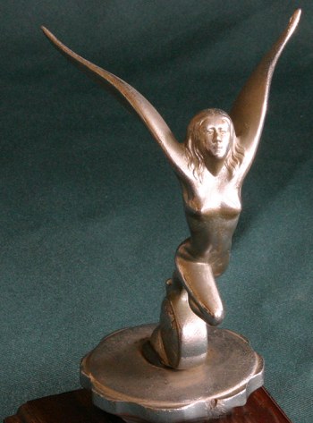 Winged Goddess On World, produced from 1936 to 1938. Made from die-cast zinc or brass and chrome plated. Used on the Vitesse, Gloria and Dolomite models.