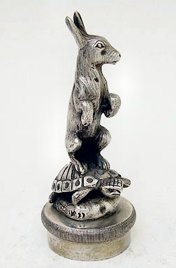 Hare riding a Tortoise by Henri Payen. This is a wonderful depiction finished in silvered bronze. Standing some 120mm high, this mascot is an extremely detailed and very rare find.