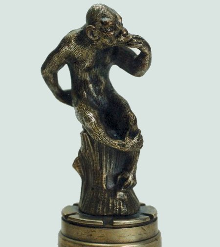 A detailed 1920s mascot depicting a Gorilla sitting on a tree stump. Signed