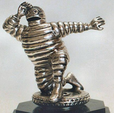 A 1920's Mr. Bibendum (Michelin Man) in the pose of a lookout and kneeling on a tyre. Mr. Bibendum is the advertising figure for the French Michelin tyre company.
